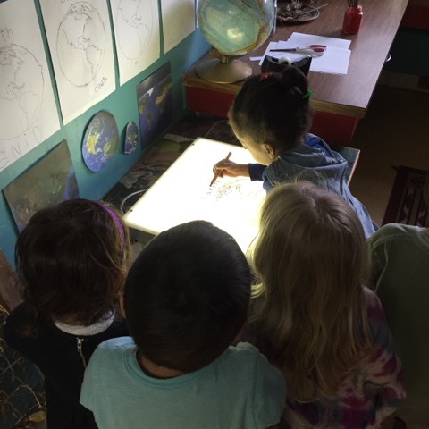 We set up an invitation for the children to trace the outline of the Earth on our light table. They traced the continents, and talked about land vs water. We also found what we were tracing on our globe.