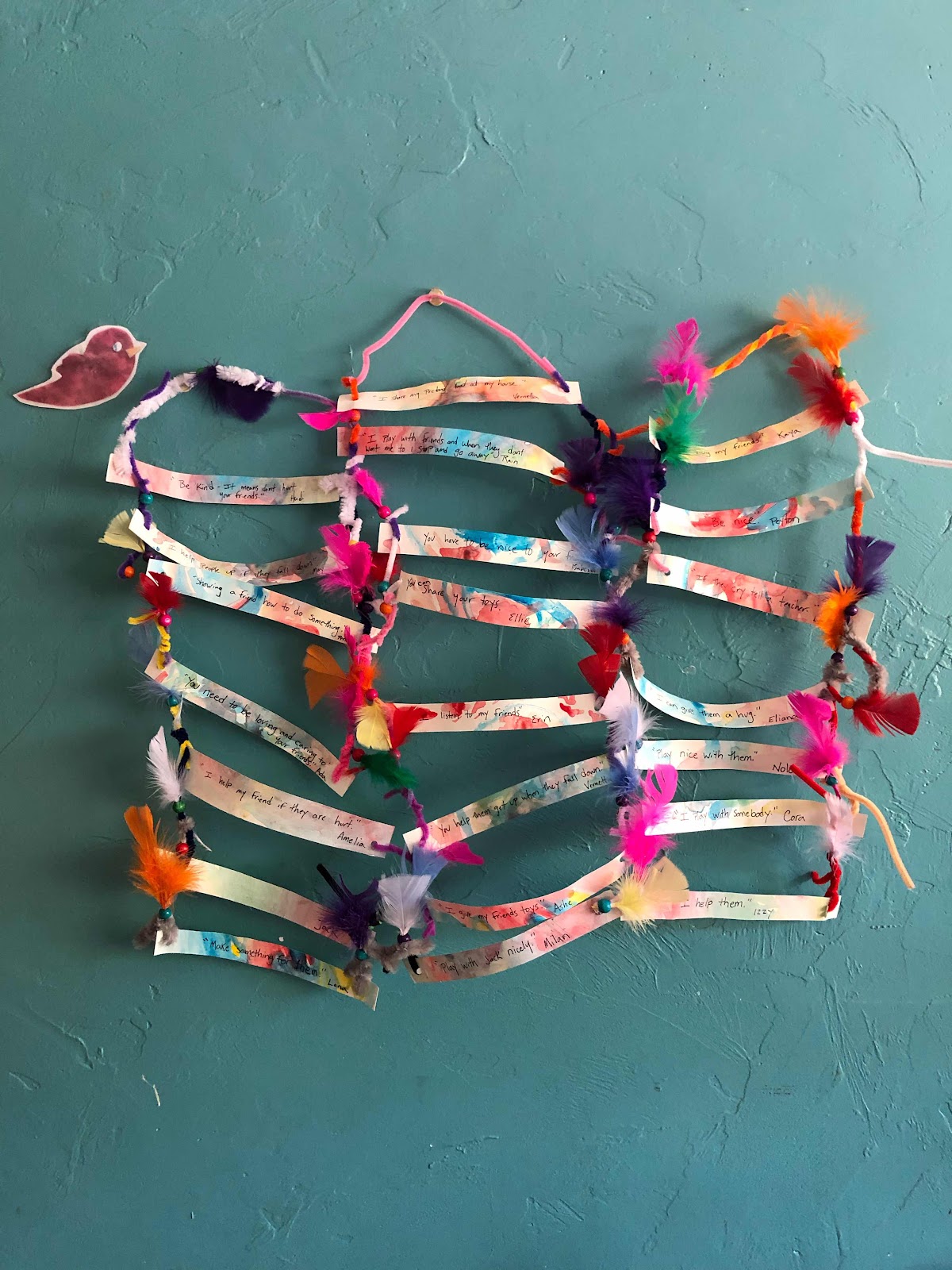 This art project was done collectively from start to finish. The children painted, drew lines, cut and punched holes side by side. We had conversations about friendship and the best way to treat our friends.